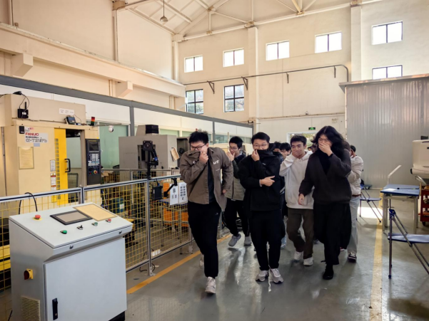 13 时 30 分,随着专用烟雾弹点燃,模拟火灾场景迅速形成,消防警铃准时响起,消防逃生演习正式启动。实验中心教师反应迅速,第一时间拨打保卫处值班电话报告 “火情”,同时组织现场 30 余名师生开展疏散。在教师的有序引导下,全体人员弯腰低姿、用衣物捂住口鼻,沿着预设疏散通道快速撤离,全程紧张有序、配合默契,仅用数分钟便全部安全疏散至室外指定集合区域。