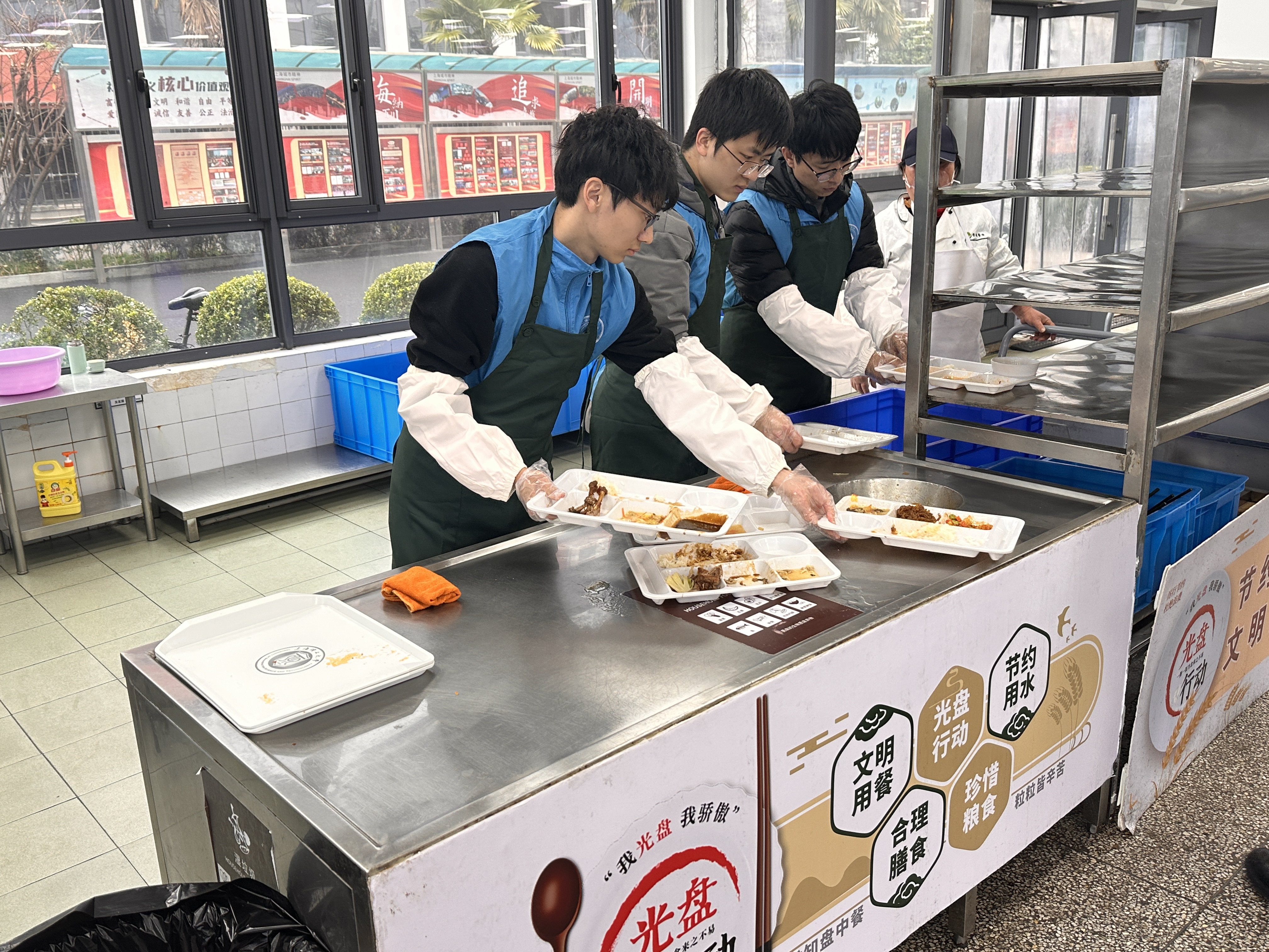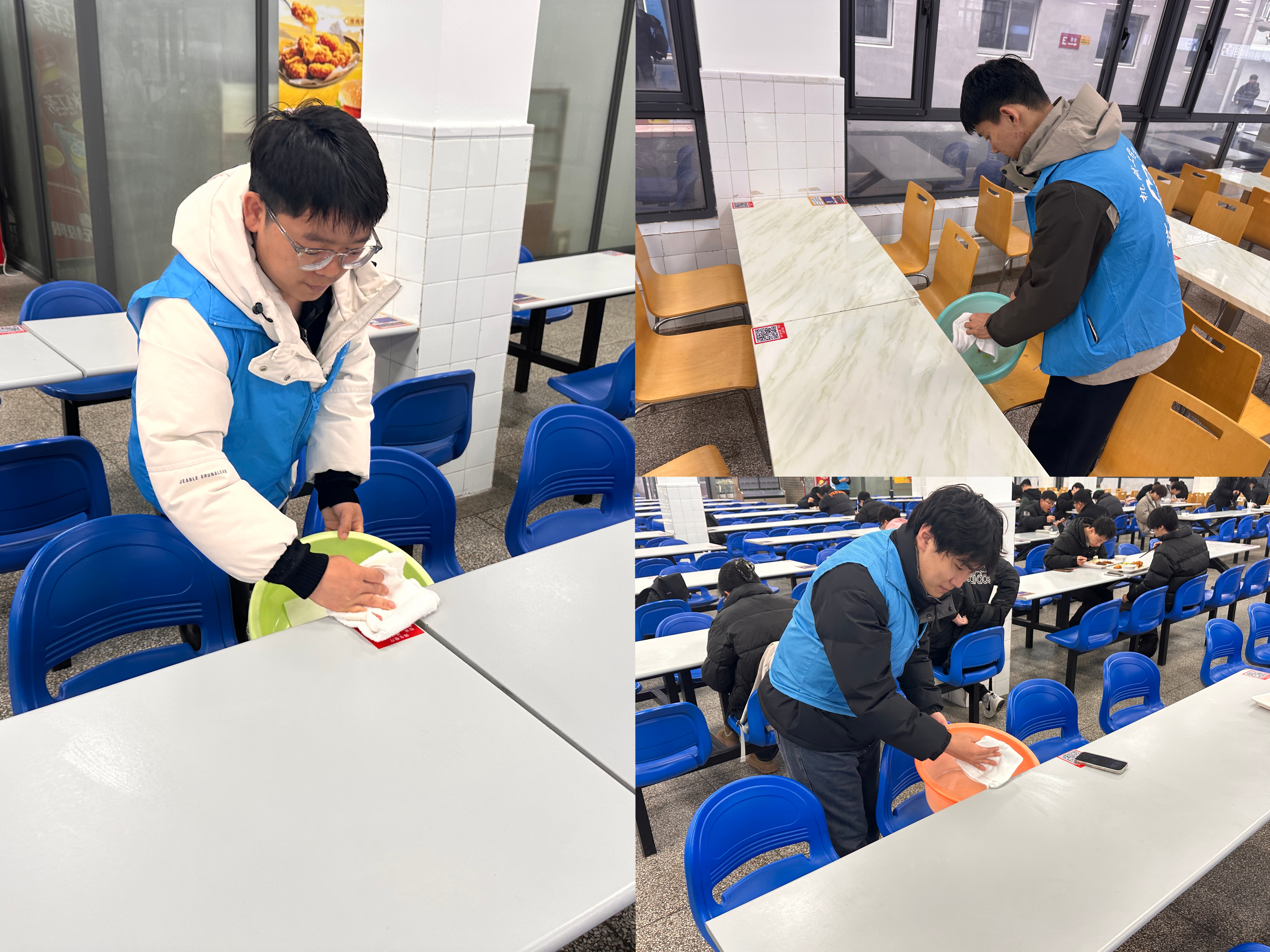 在本次学雷锋日活动中,志愿者们深入食堂一线,充分发扬服务同学、助人为乐的雷锋精神。他们协助食堂工作人员清理用餐区卫生:将散乱的桌面擦拭干净,把残留的汤渍、菜叶和餐巾纸整理清除,将使用过后的碗筷、餐盘有序收集。通过这些平凡而细致的劳动,同学们用实际行动诠释了雷锋精神,营造了更加温馨和谐的校园生活氛围,也带动更多同学自觉维护公共环境,发扬青年志愿者的责任与担当。